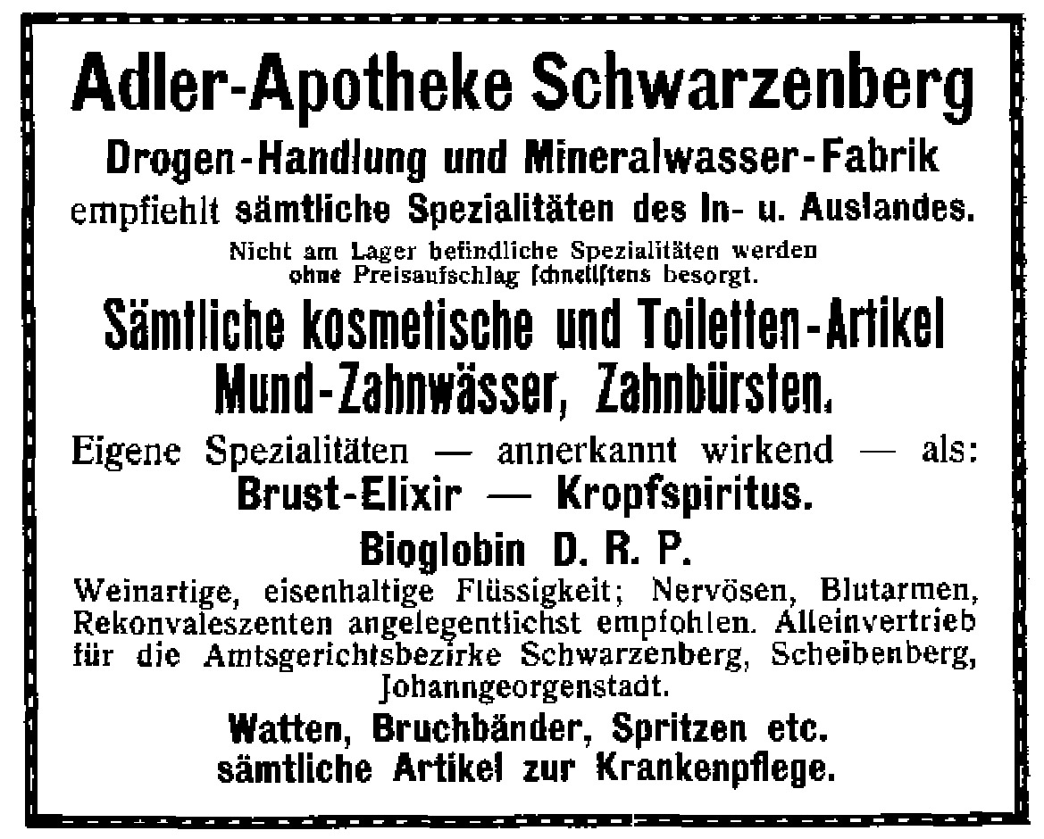 Inserat Adler-Apotheke, Schwarzenberg, Obere Schloßstraße 7; um 1925 |