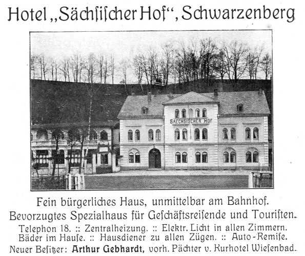 Inserat Hotel Sächsischer Hof Schwarzenberg, Bahnhofstraße; Nachdem das Hotel seinen Betrieb eingestellt hatte, wurde das Haus zunächst von der Gewerbeschule genutzt. Zu DDR-Zeiten war die Verwaltung der HO untergebracht und der Anbau links war zunächst als Fahrzeughaus umgebaut, war danach Möbelhaus und nach erneutem Umbau hat heute die Commerzbank Schwarzenberg ihren Sitz. |