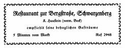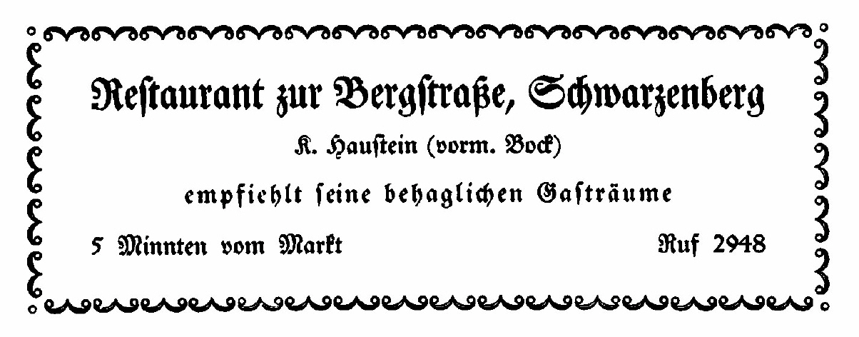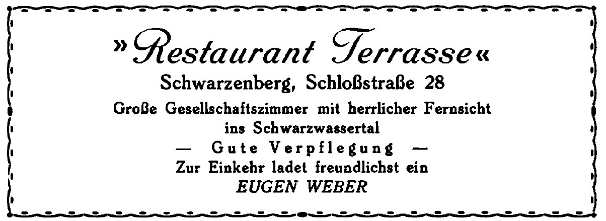 Inserat Restaurant Terrasse Schwarzenberg. Die Gaststätte besteht heute nicht mehr. In dem Haus Obere Schloßstraße 28 hat heute der Schwarzenberger Schilder-Service seine Geschäftsräume. |