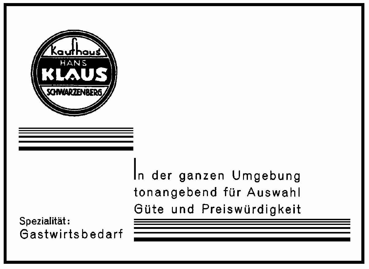 Inserat Kaufhaus Klaus, Schwarzenberg Markt, heute Geschenkeboutique Bergglas. |