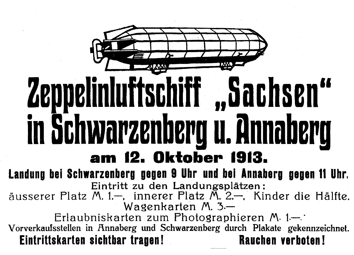 Im Jahr 1913 landete das Luftschiff "Sachsen" zwischen Schwarzenberg und Bermsgrün. Hier die Ankündigung der Landung in der Presse.