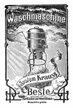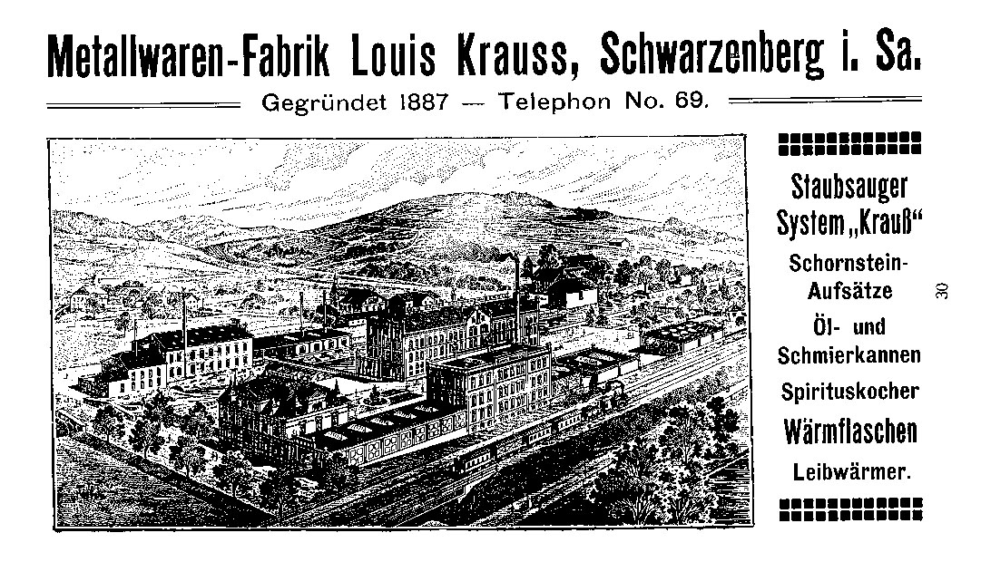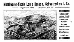 Inserat Firma Krauß um 1912. Im 1899 war die Metallwarenfabrik von Karl Louis Krauß von Neuwelt nach Schwarzenberg umgezogen und hatte bis 1912 schon mehrere Erweiterungsbauten hinter sich, so unter anderem die erste Feuerverzinkerei im oberen Erzgebirge. |