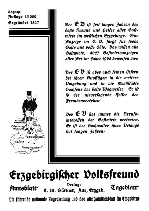 Inserat Erzgebirgischer Volksfreund - Der Verlag hatte seinen Sitz in Aue und in Schwarzenberg hatte die Druckerei C. M. Gärtner ihren Sitz. |
